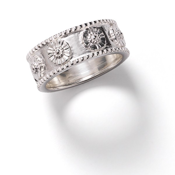 The Florence Floral Ring features the iconic rosettes, framed by a beaded edge. Timeless and elegant, it makes a striking statement on its own or when layered for a modern, layered look.